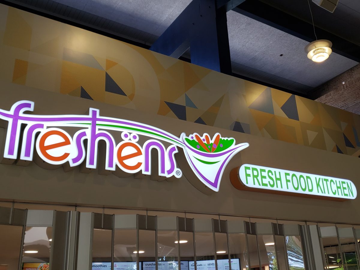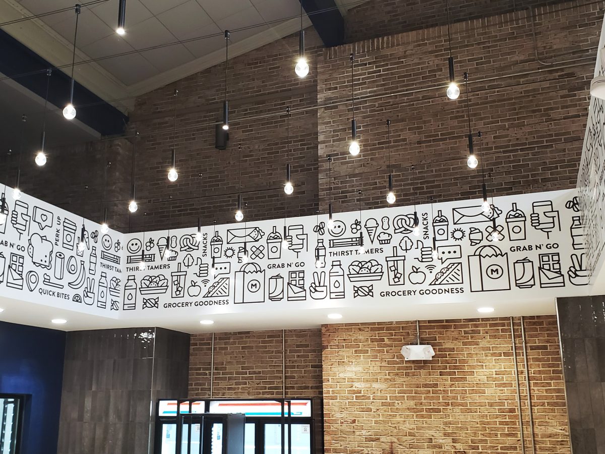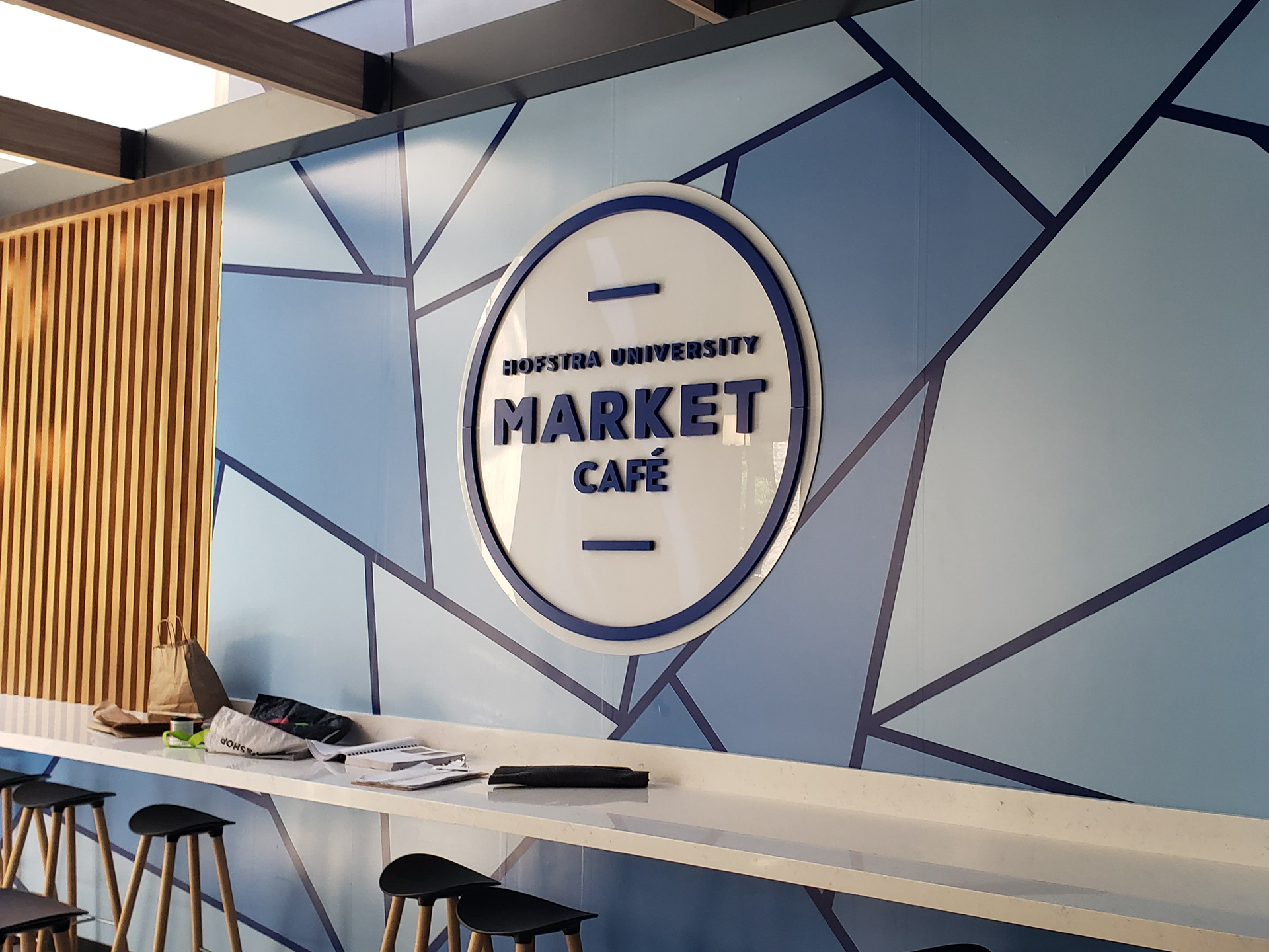 Integrated environmental graphics and digital menu systems developed to enhance the dining experience, featuring precision-fabricated raised acrylic elements and coordinated color applications aligned with the university’s architectural program.