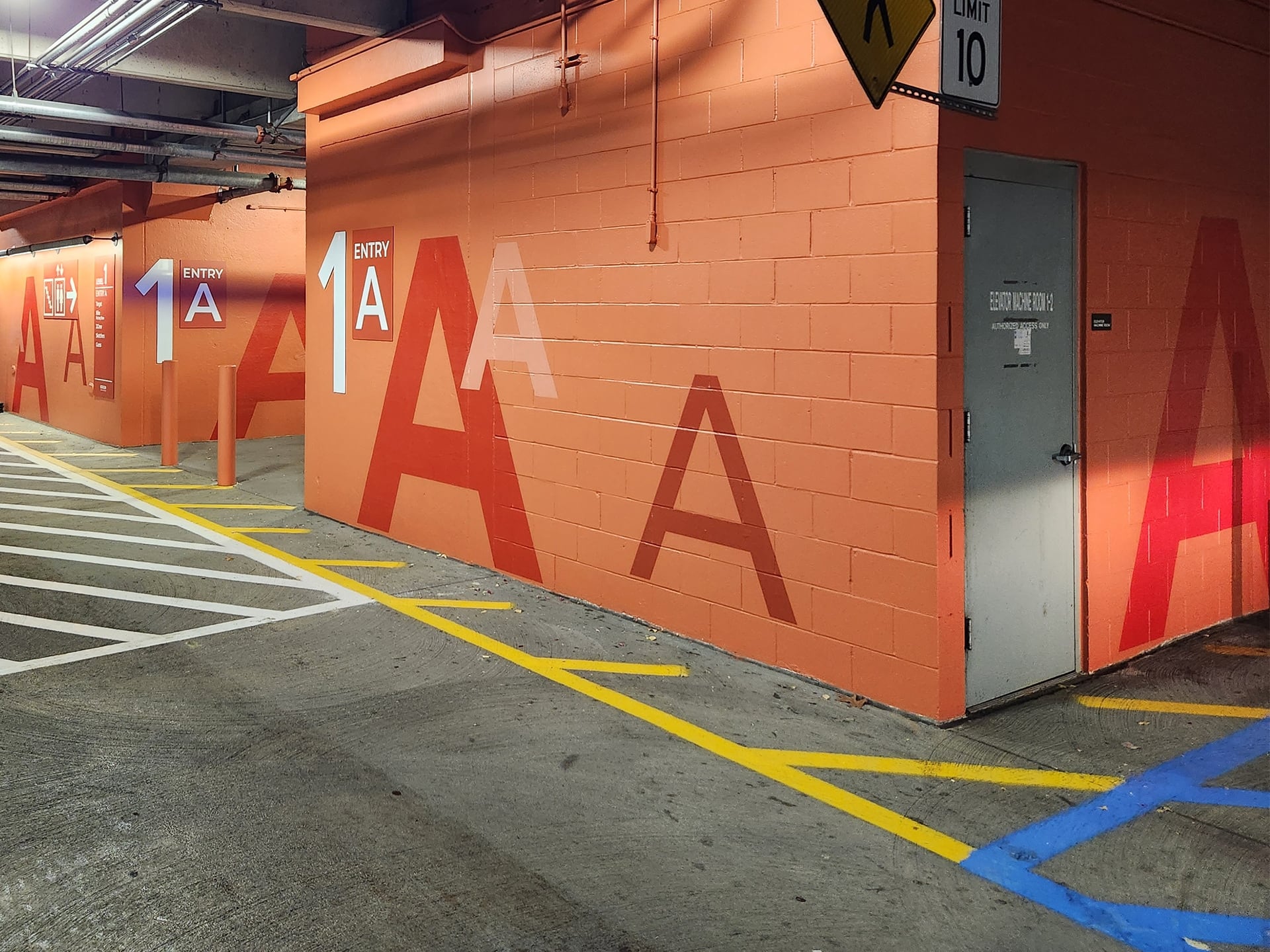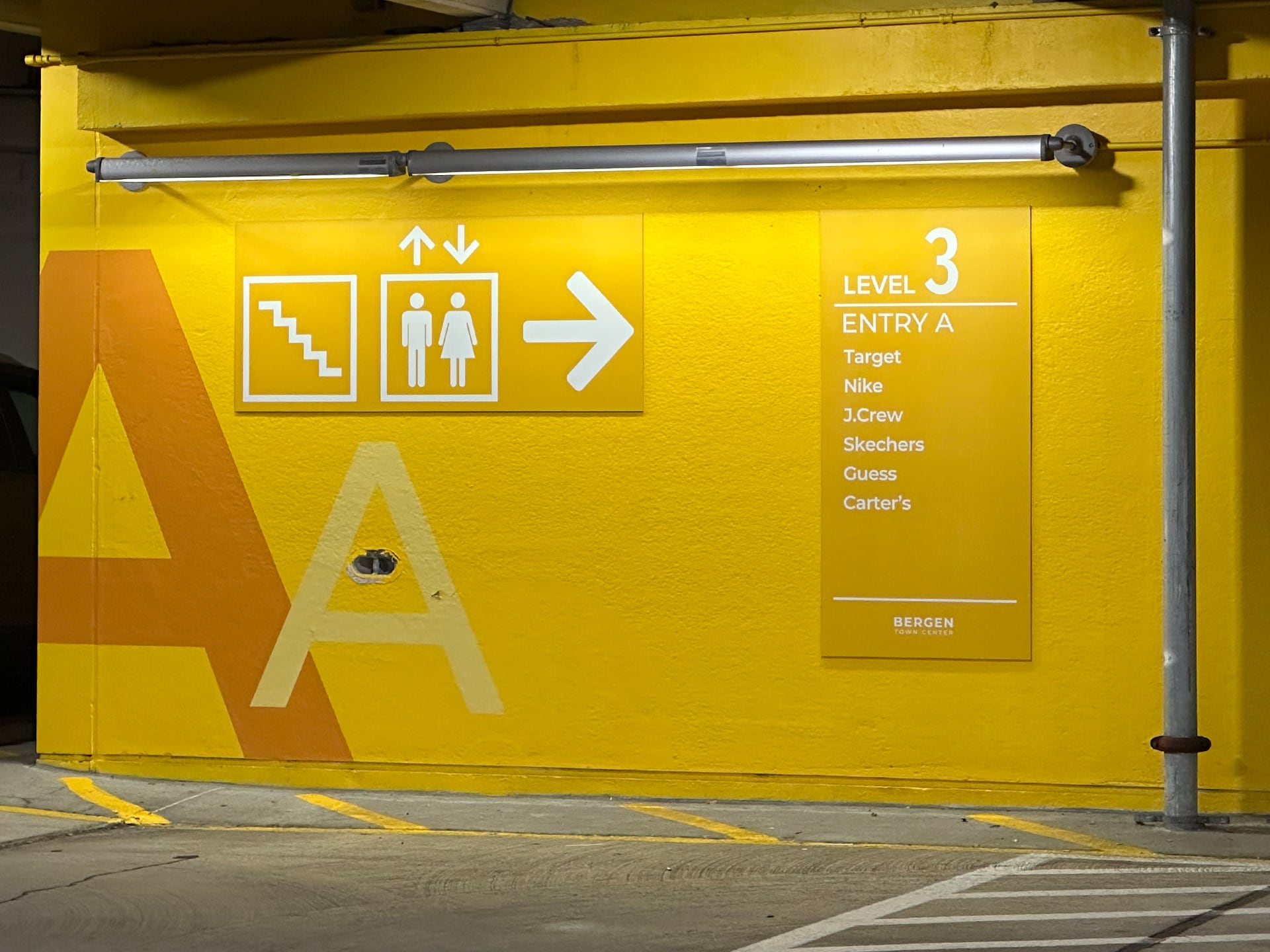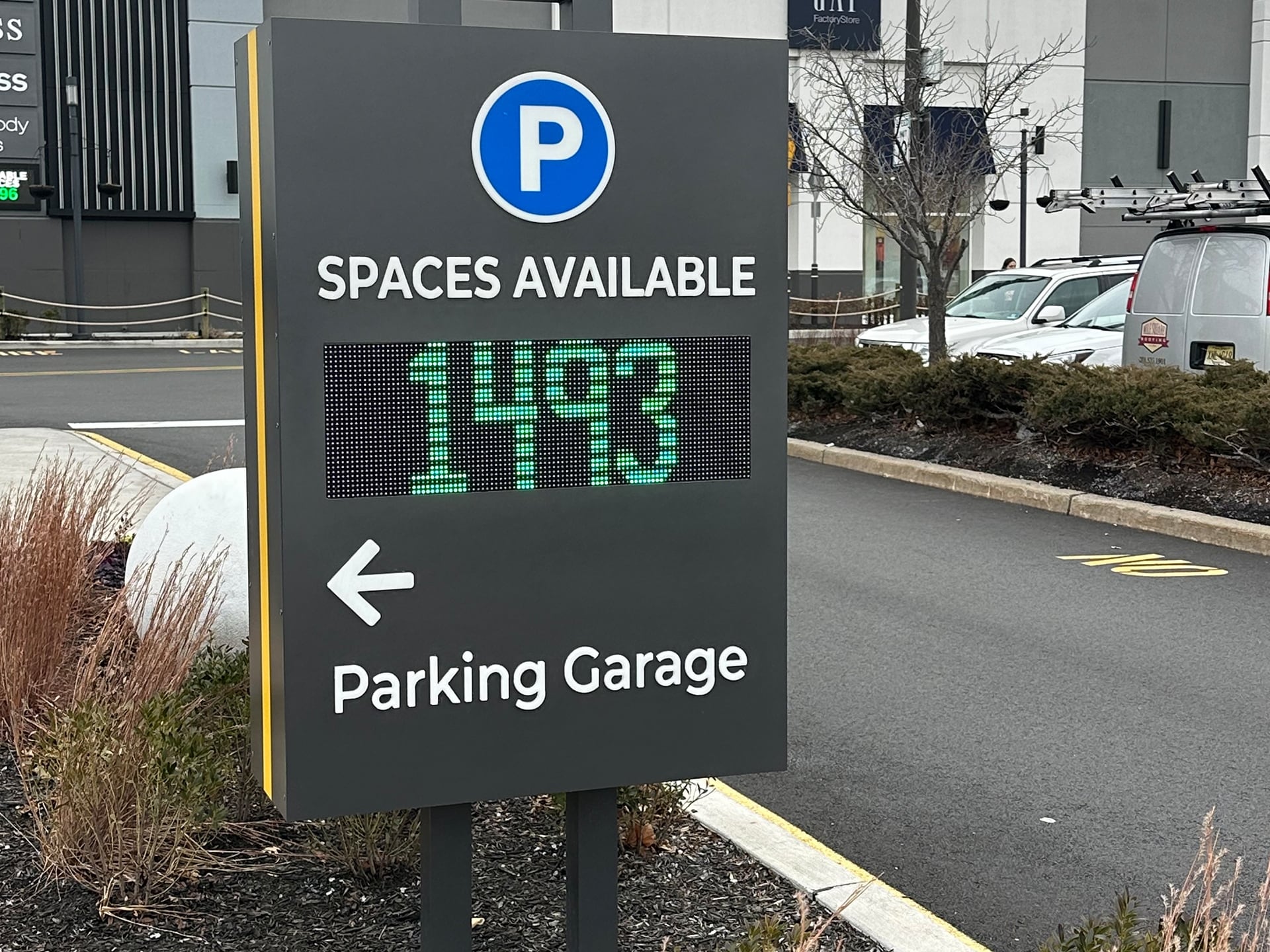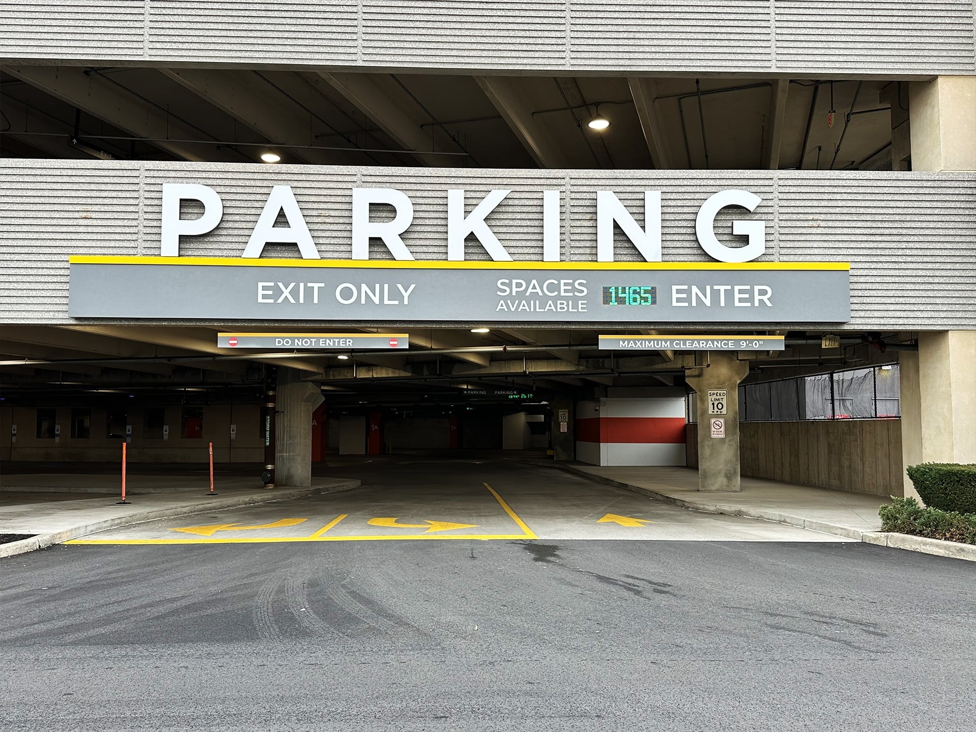 Integrated parking guidance and wayfinding system designed to enhance circulation and user experience, combining environmental graphics, digital directional displays, and electronic parking technology to guide visitors efficiently to designated levels and retail entrances.