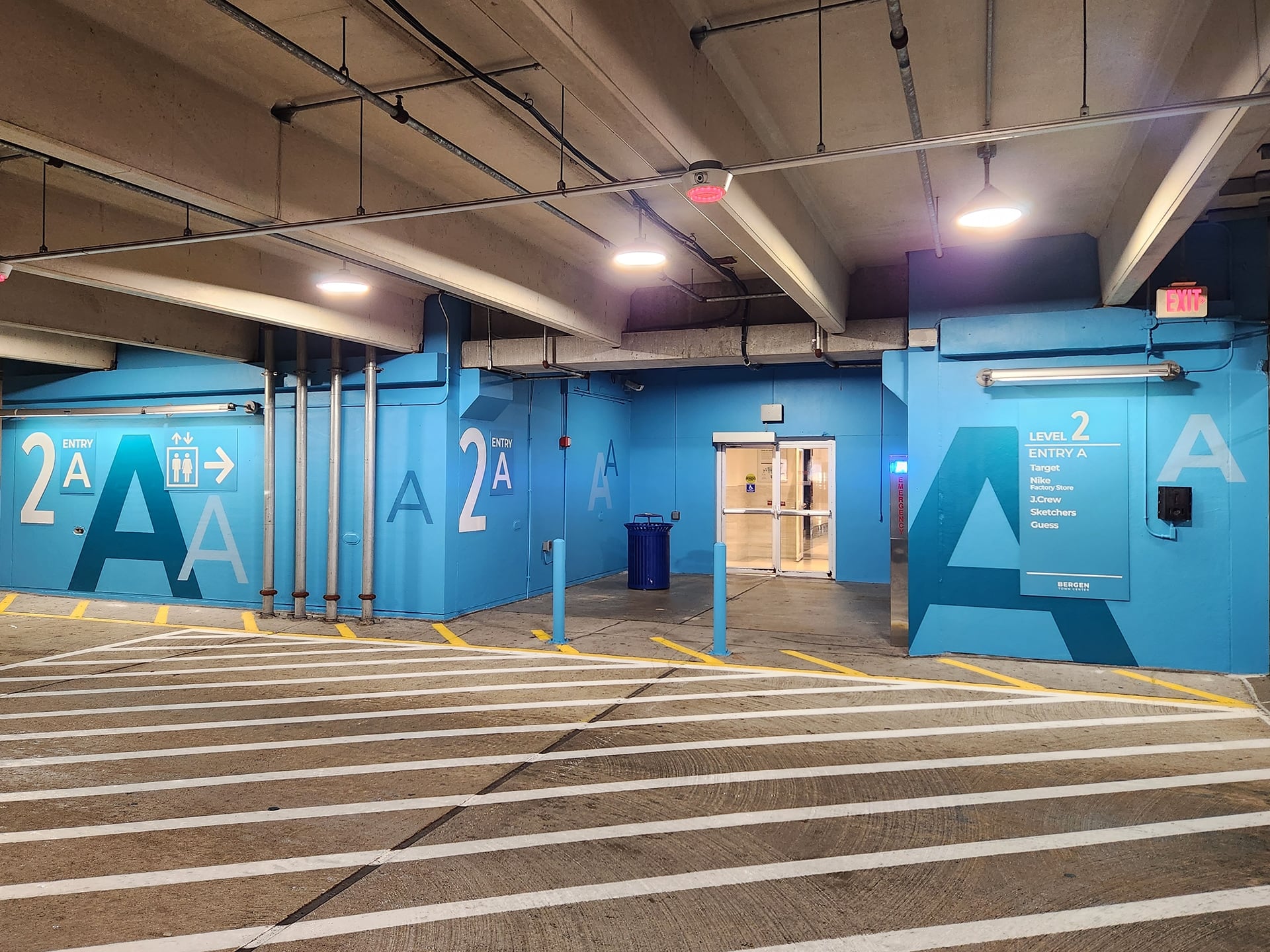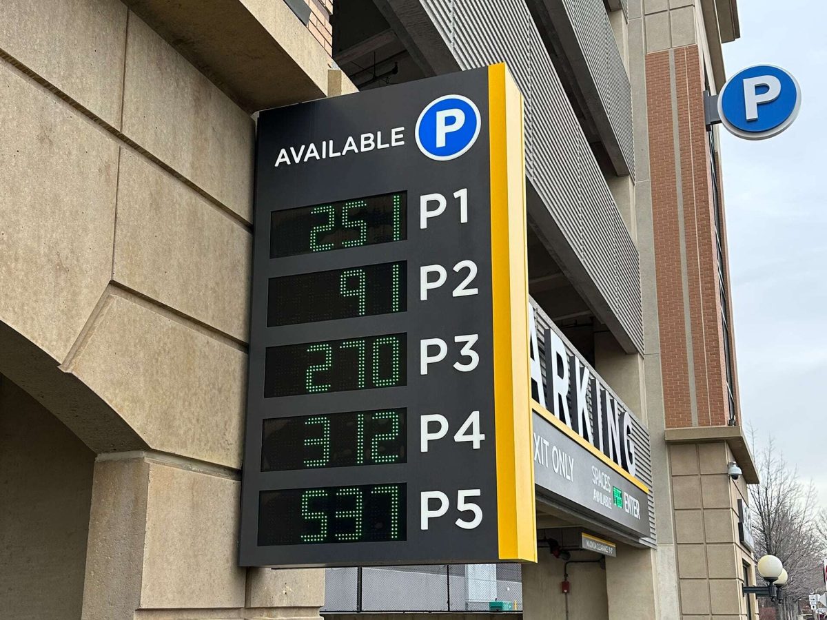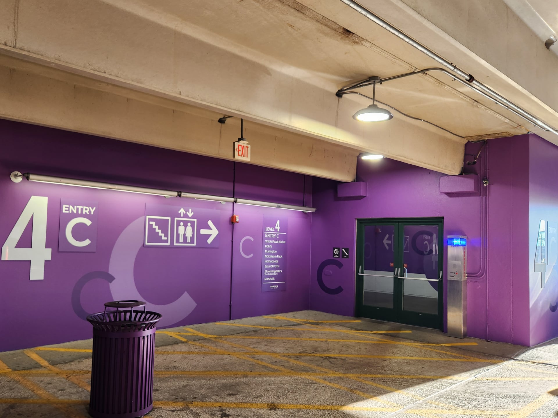 Integrated parking guidance and wayfinding system designed to enhance circulation and user experience, combining environmental graphics, digital directional displays, and electronic parking technology to guide visitors efficiently to designated levels and retail entrances.
