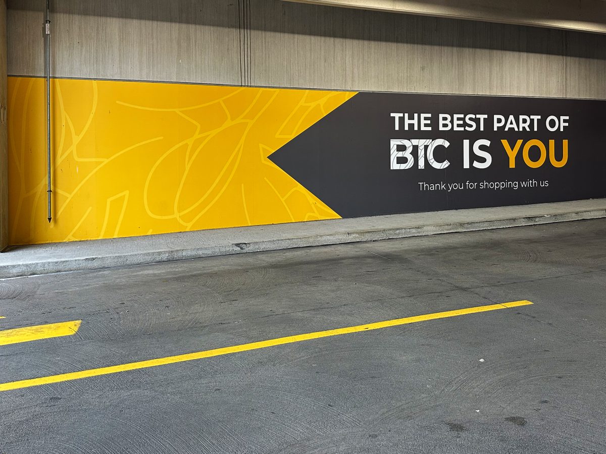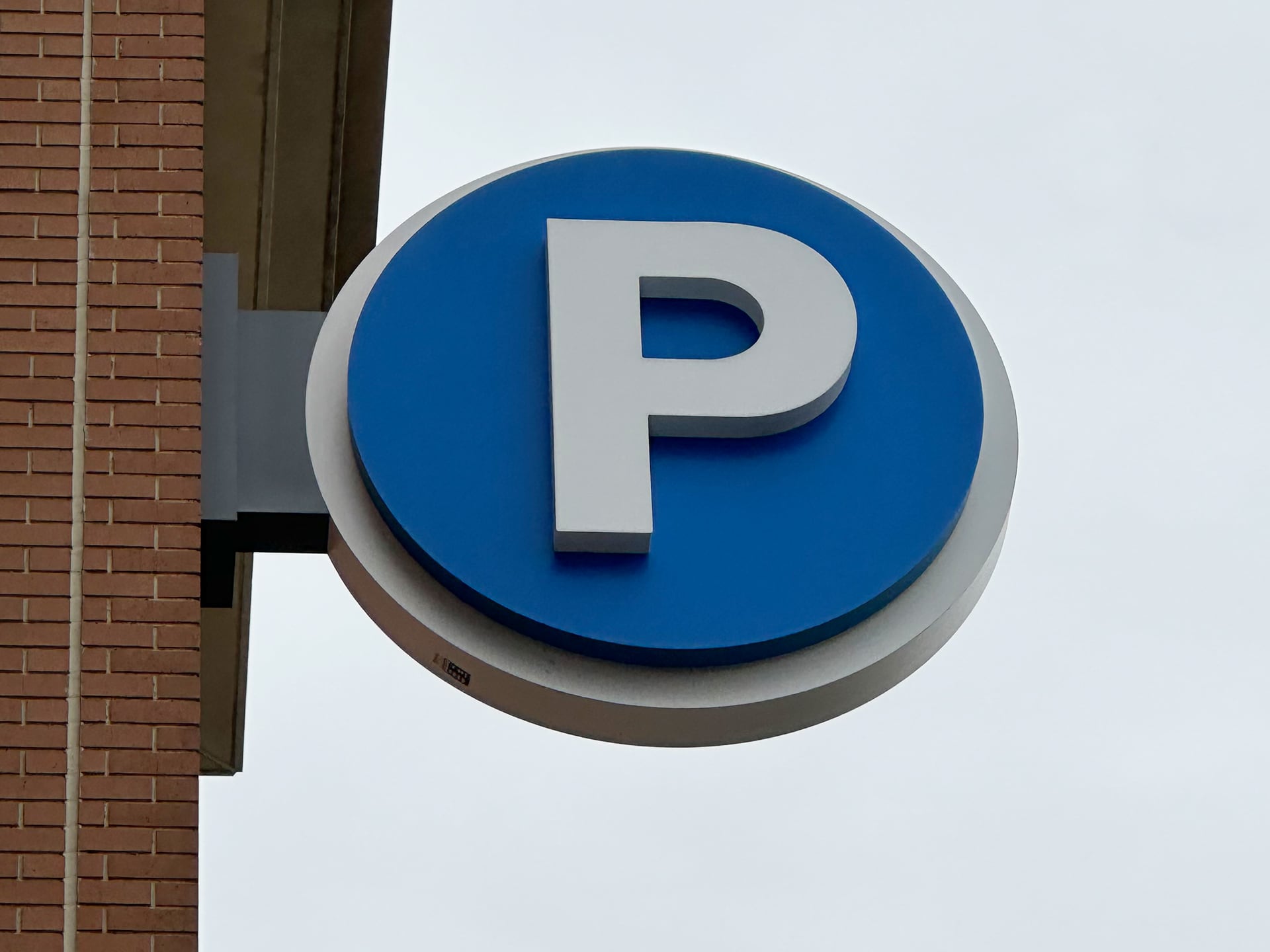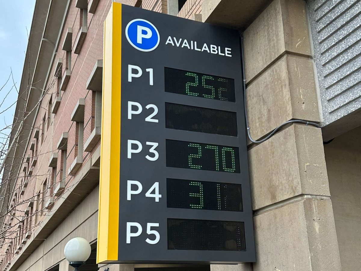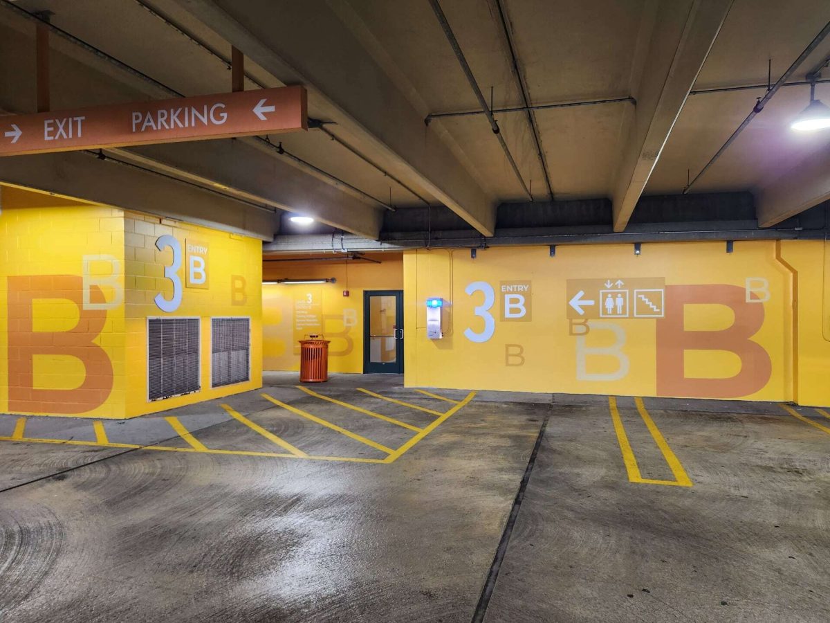 Integrated parking guidance and wayfinding system designed to enhance circulation and user experience, combining environmental graphics, digital directional displays, and electronic parking technology to guide visitors efficiently to designated levels and retail entrances.